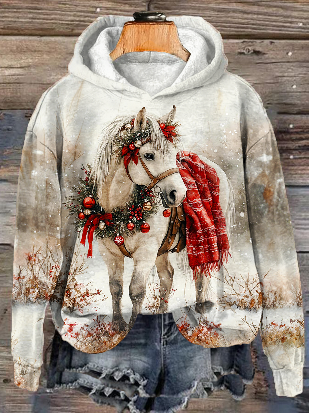 Christmas Horses Long Sleeve Printed Hoodie