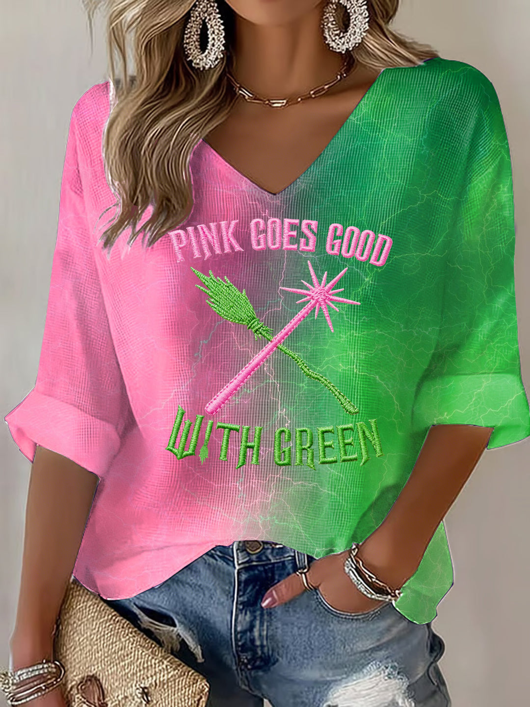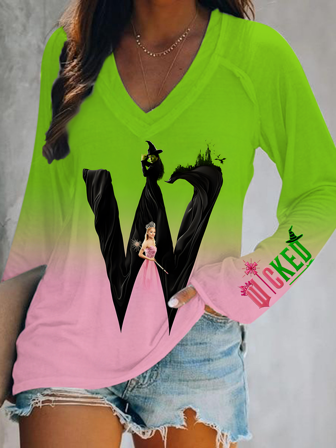 Wicked For Good Print V-Neck Long Sleeve Top