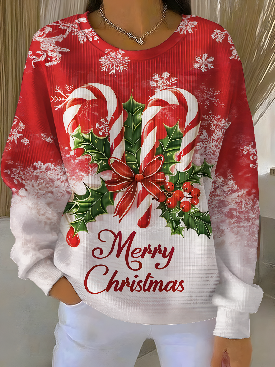 Merry Christmas Holly Berries Print Casual Crew Neck Pullover Sweater