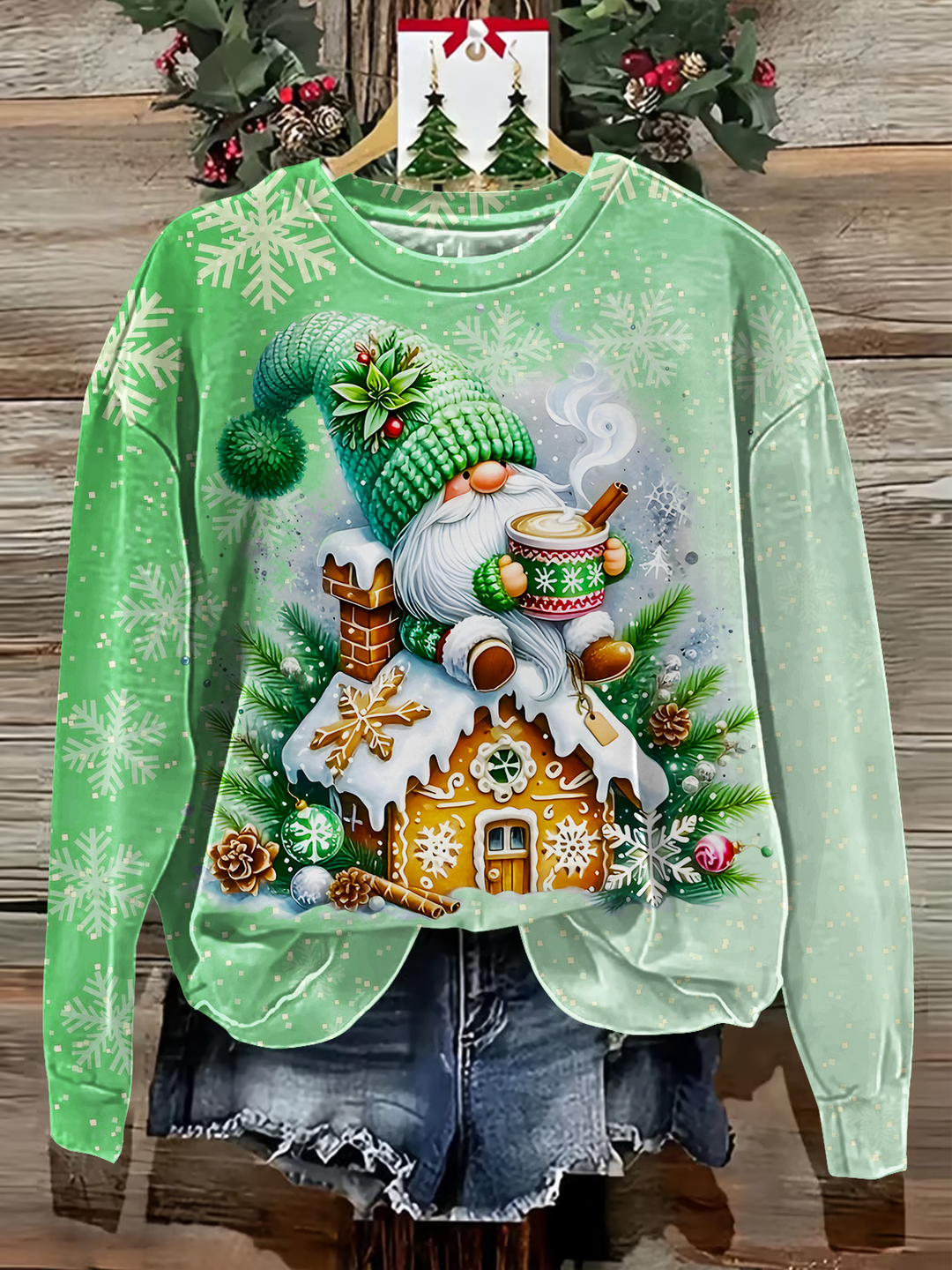 Christmas Gnomes And Gingerbread Houses Printed Long Sleeve Casual Top