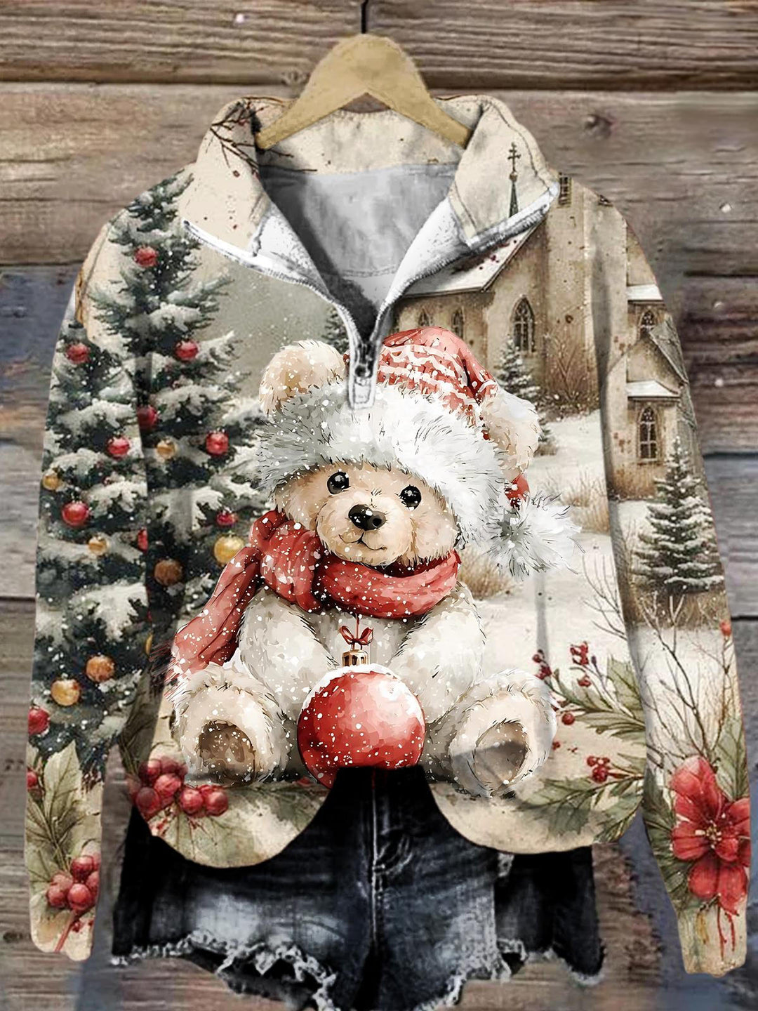 Retro Christmas Bear Women's Lapel Long Sleeve Top