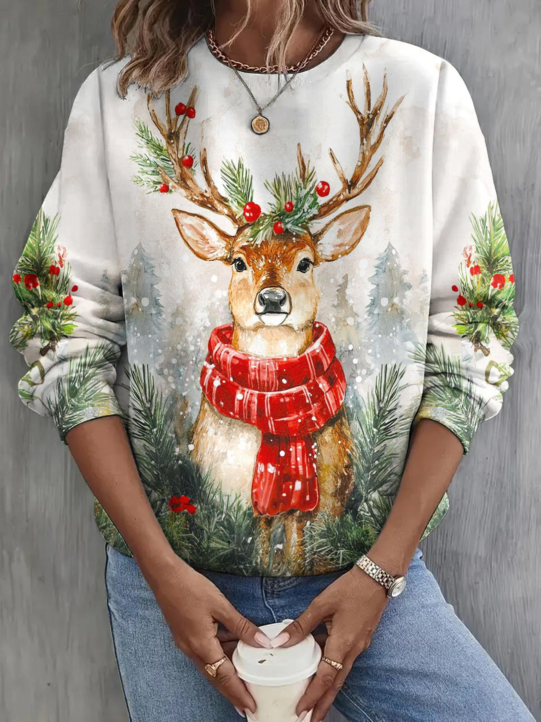 Christmas Retro Reindeer Print Long Sleeve Casual Top