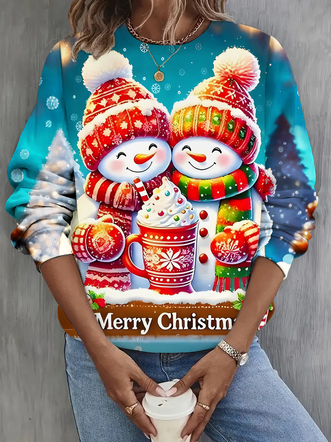 Merry Christmas Coffee Snowman Printed Long Sleeve Casual Top