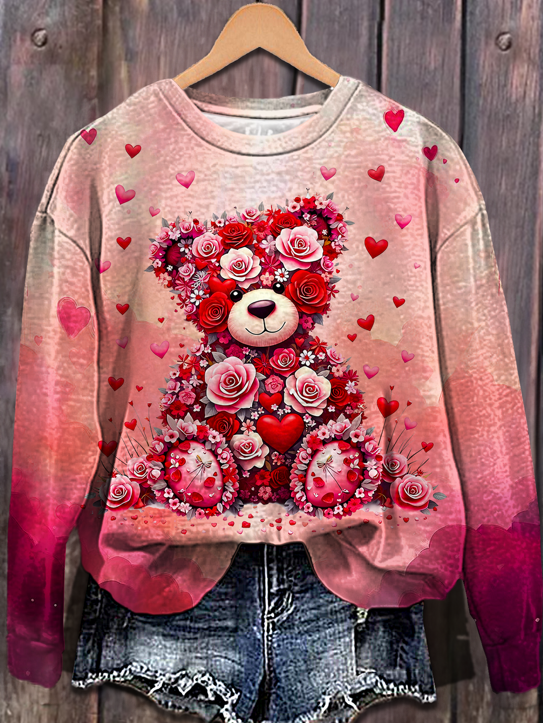Pink Floral Valentine's Day Bear Printed Long Sleeve Casual Top