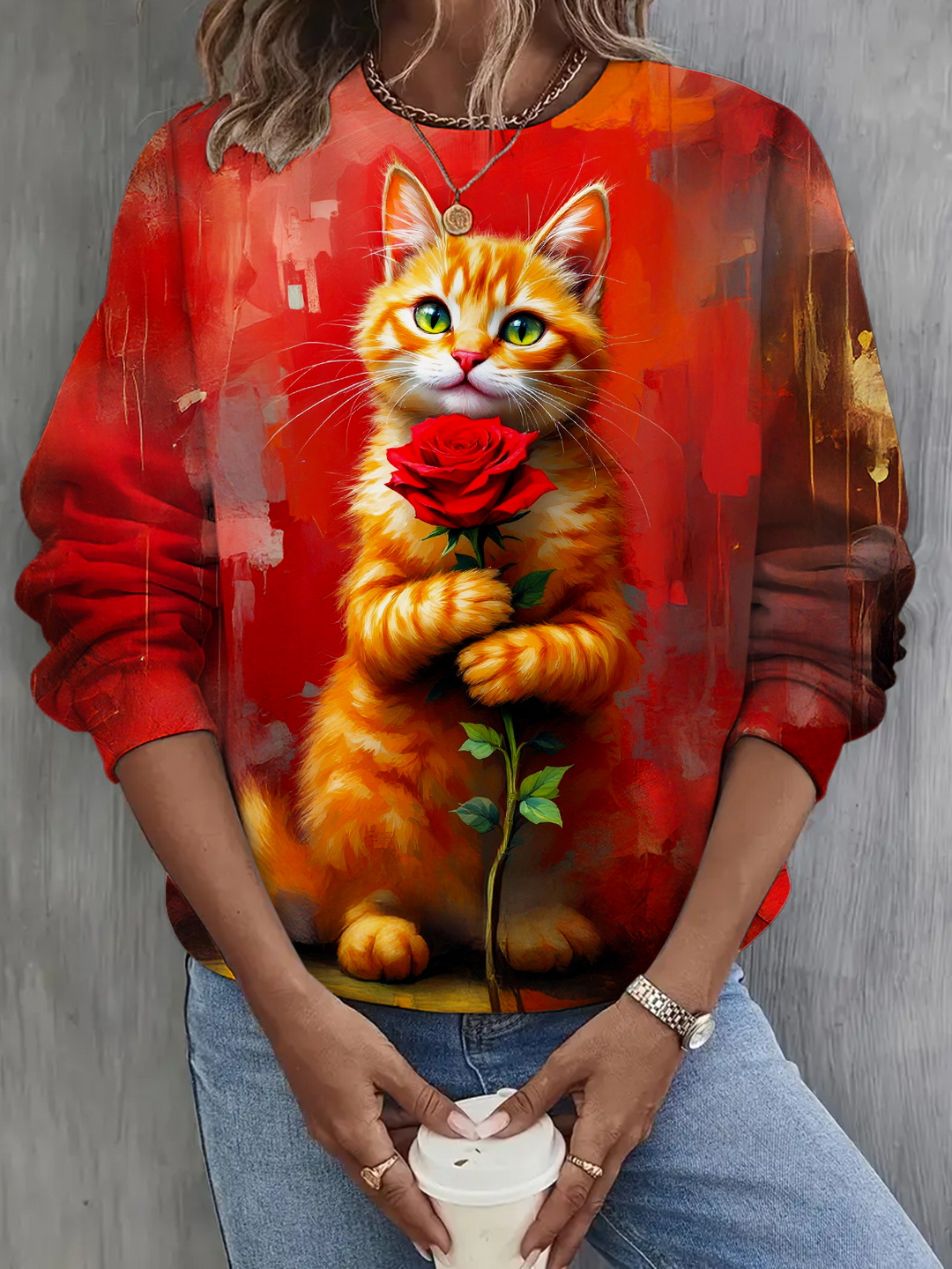Vintage Rose Valentine's Day Cat Long Sleeve Casual Top