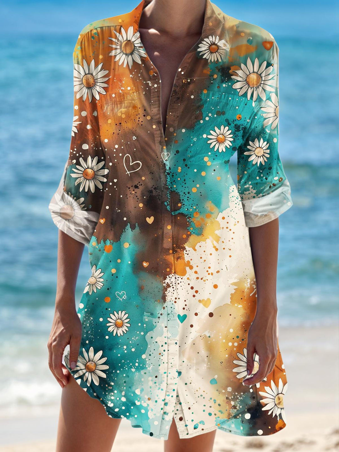 Irregular Chrysanthemum Long Sleeve Beach Shirt Dress