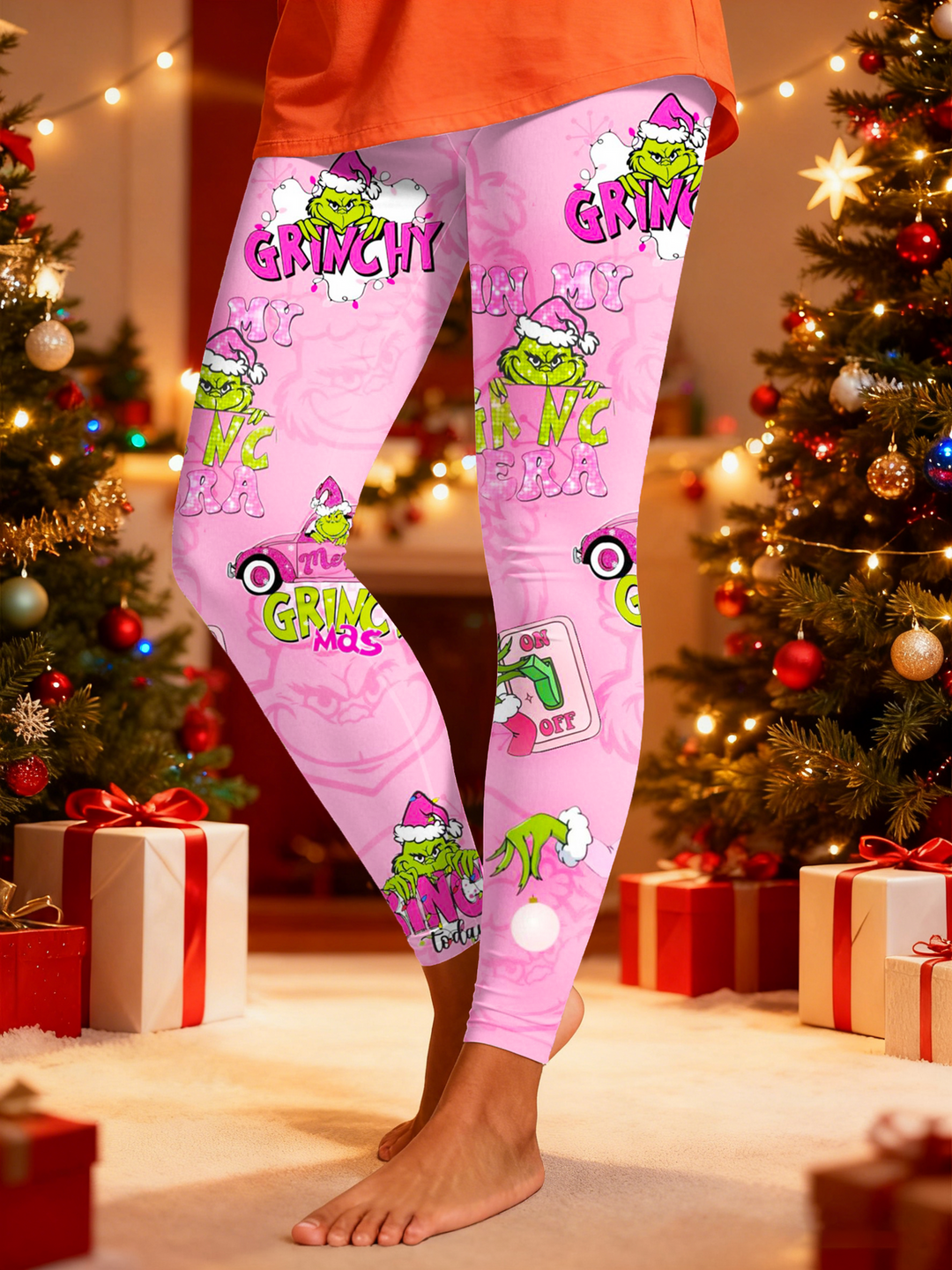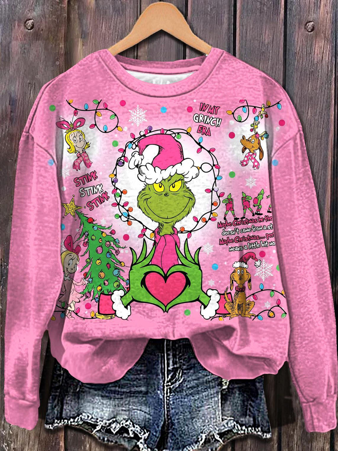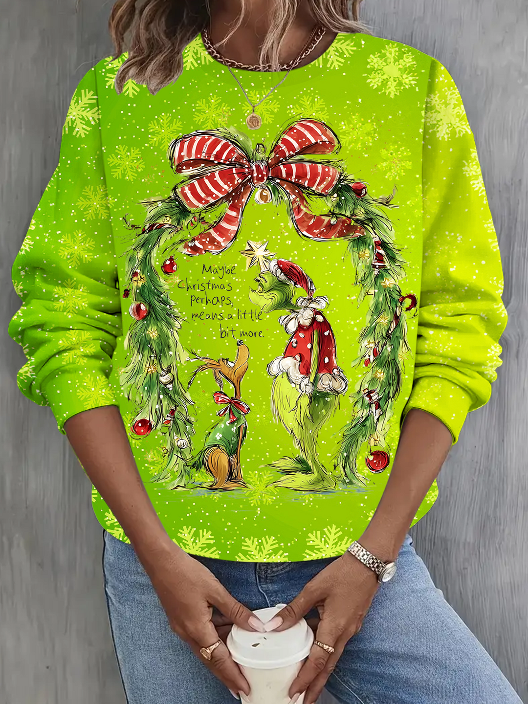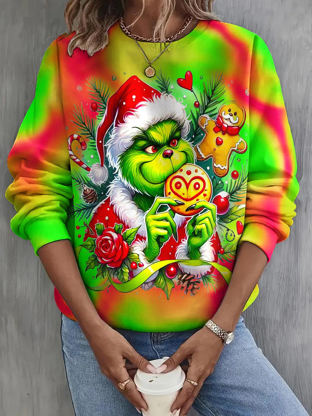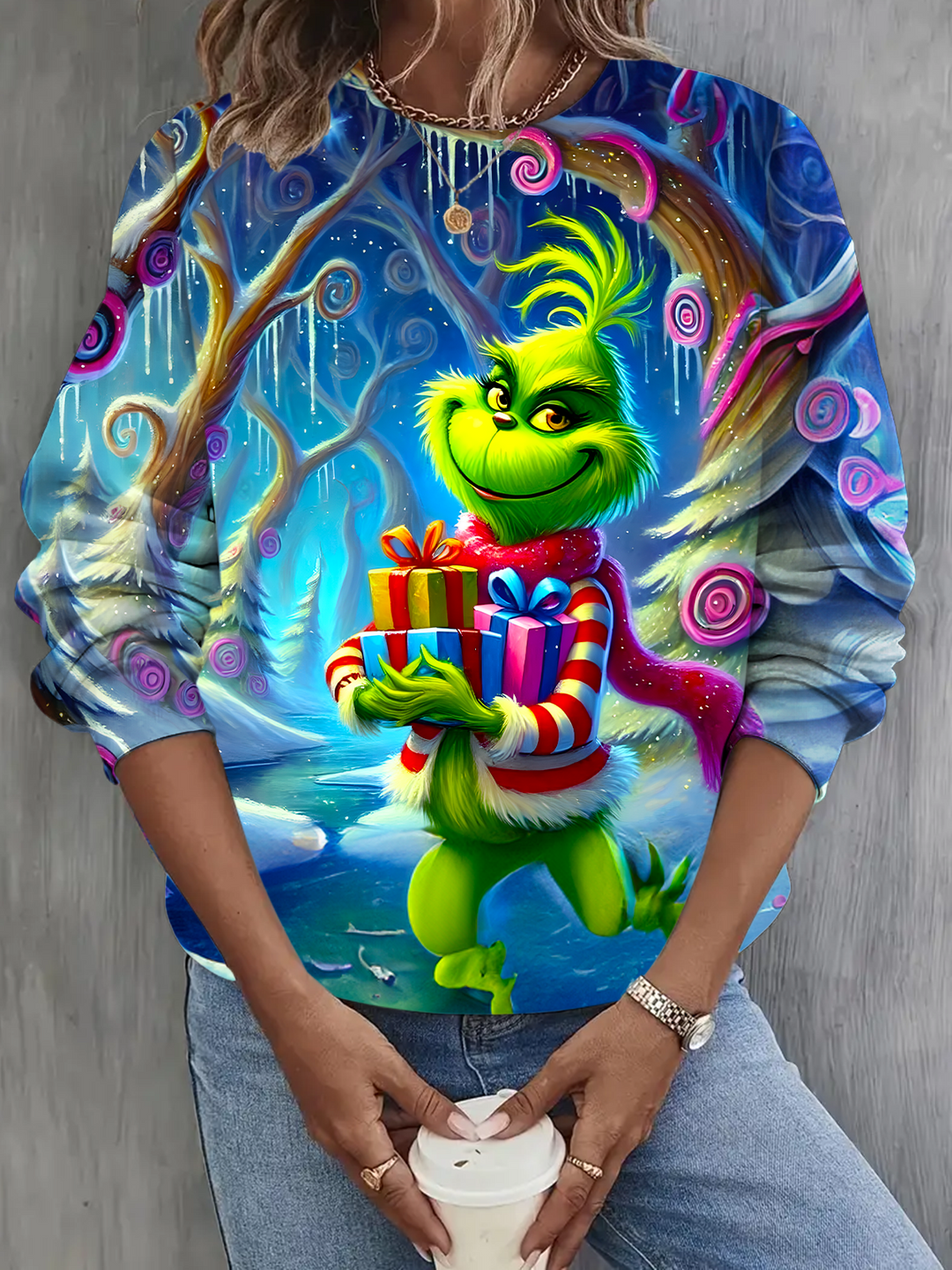 Hand Drawn Christmas Grinch Printed Long Sleeve Casual Top