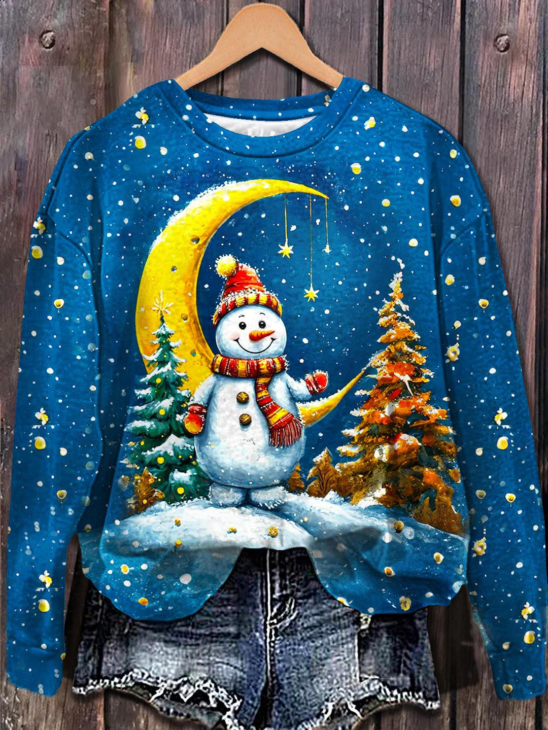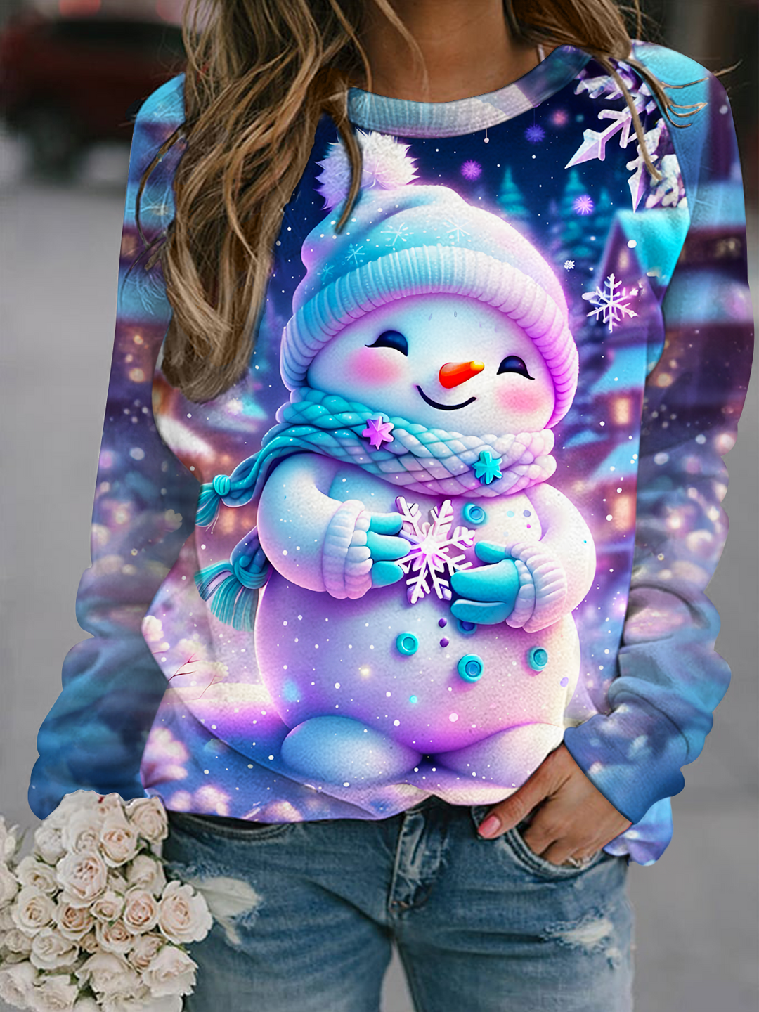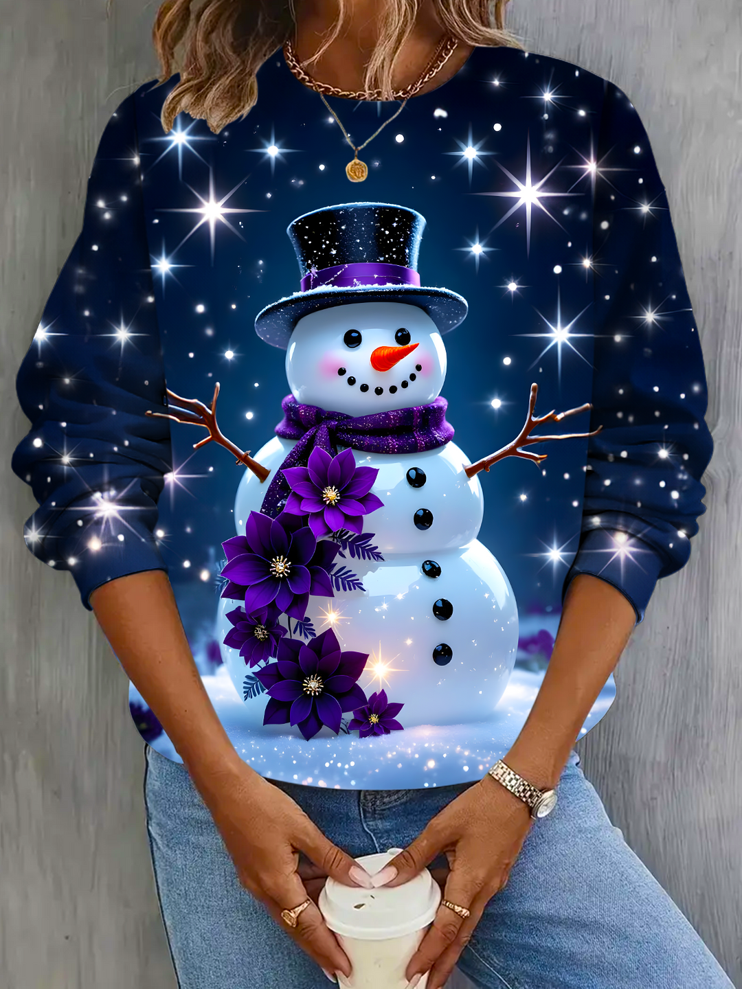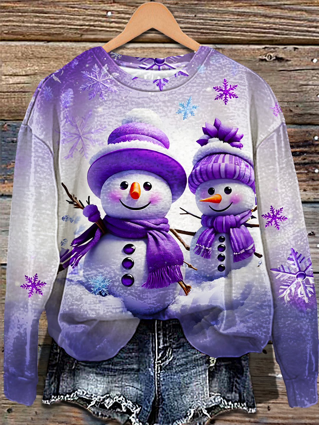 Fun Lavender Christmas Snowman Printed Long Sleeve Casual Top