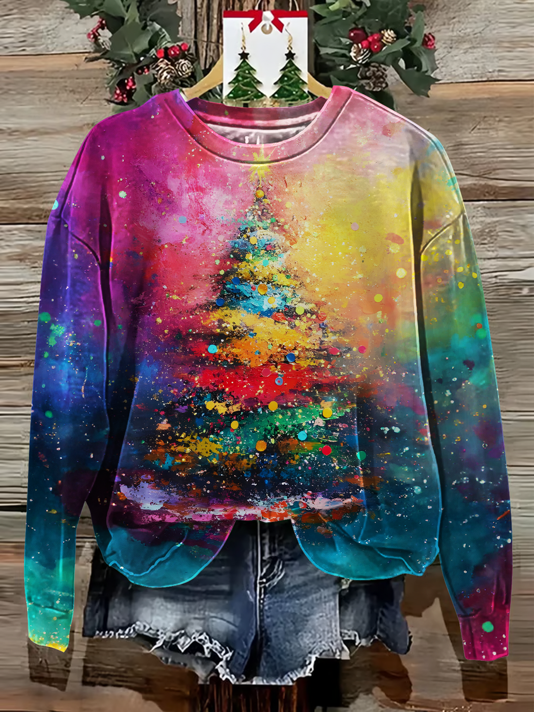 Colorful Abstract Oil Painting Christmas Tree Printed Long Sleeve Casual Top