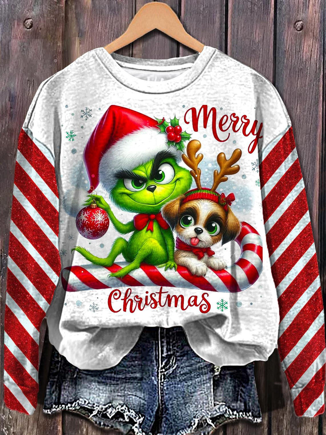 Christmas Grinch Candy Print Long Sleeve Casual Top