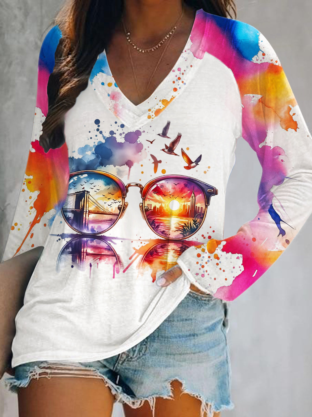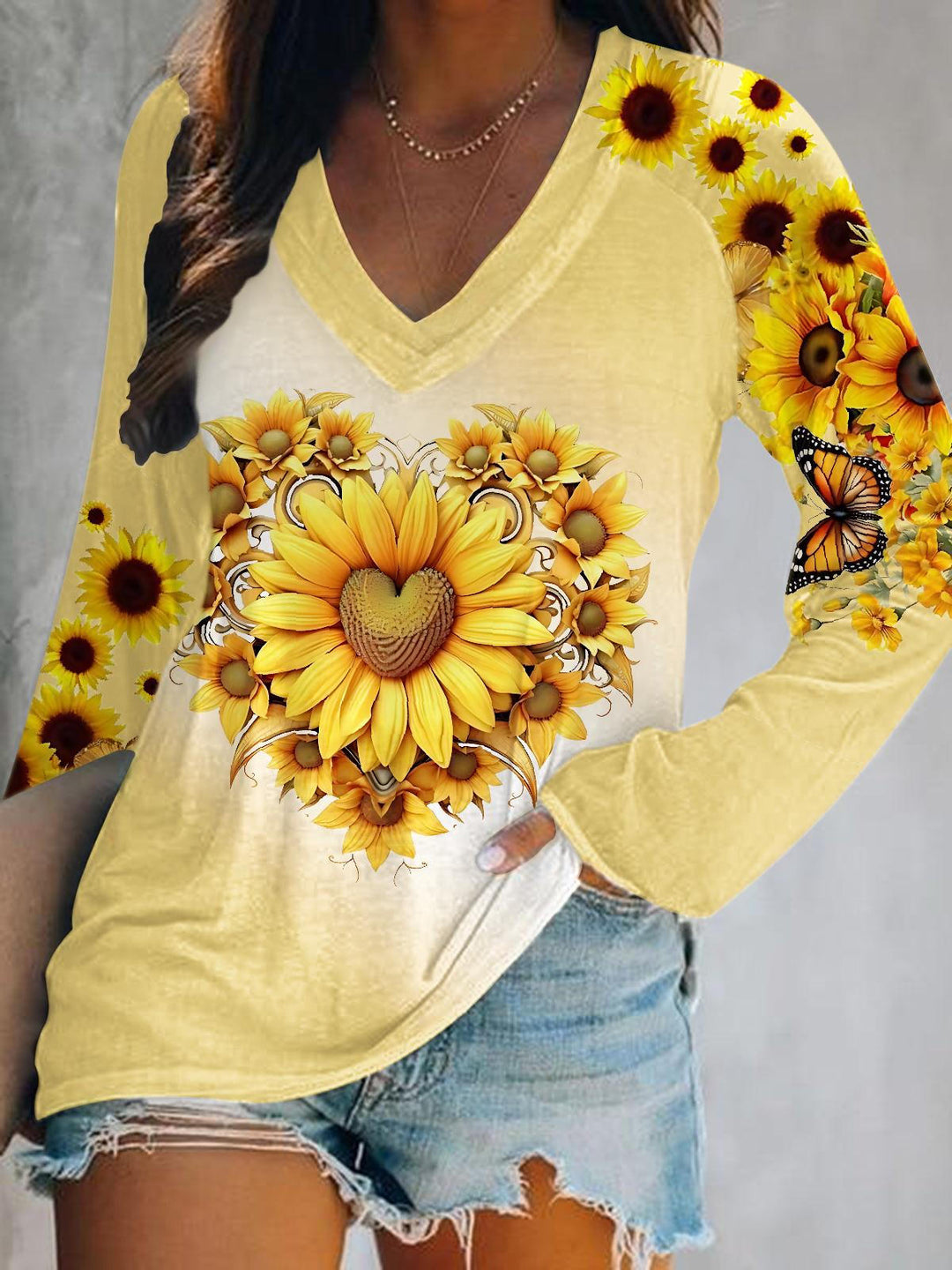 Valentine's Day Love Sunflowers Print V-Neck Long Sleeve Top