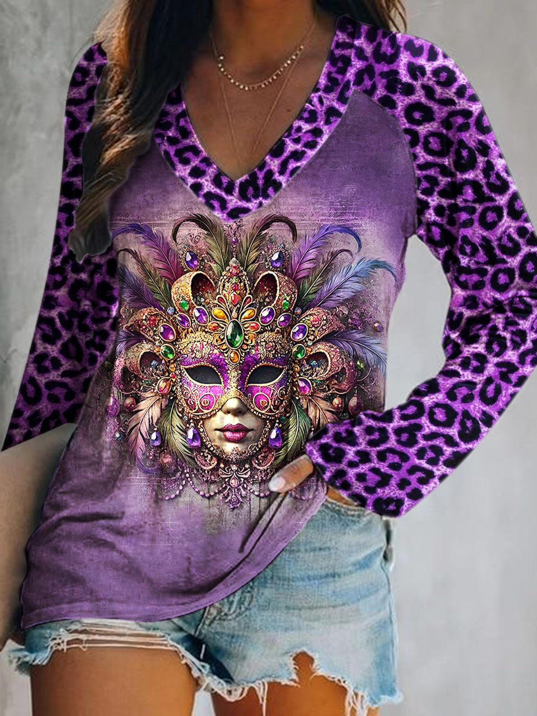 Mardi Gras Leopard Print V-Neck Long Sleeve Top