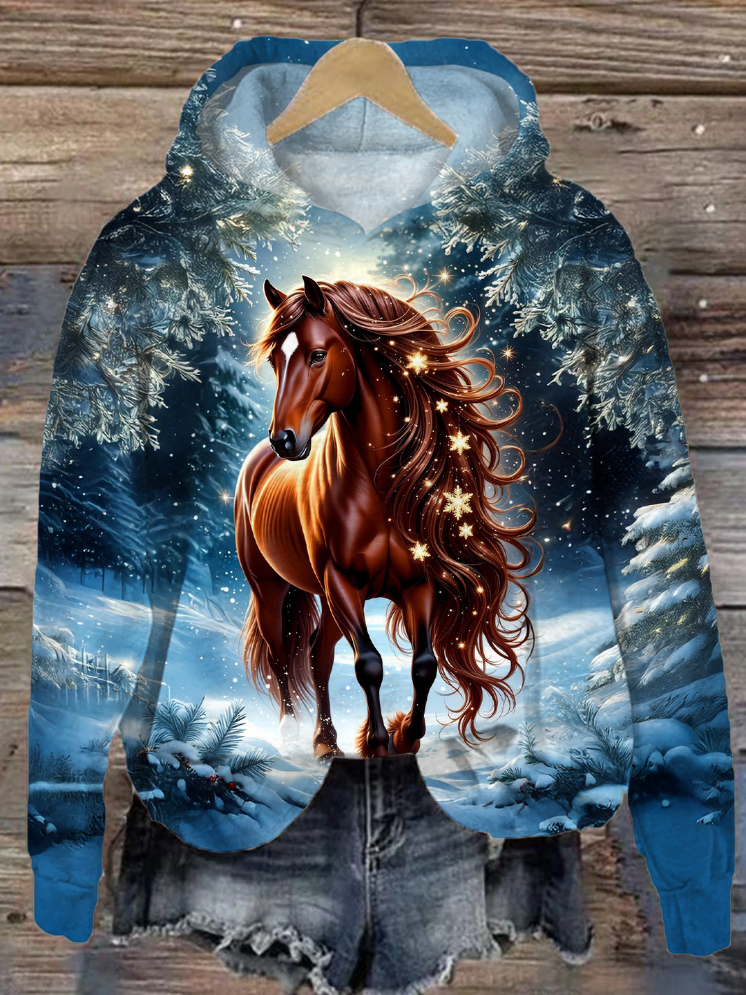 Retro Winter Horse Long Sleeve Printed Hoodie