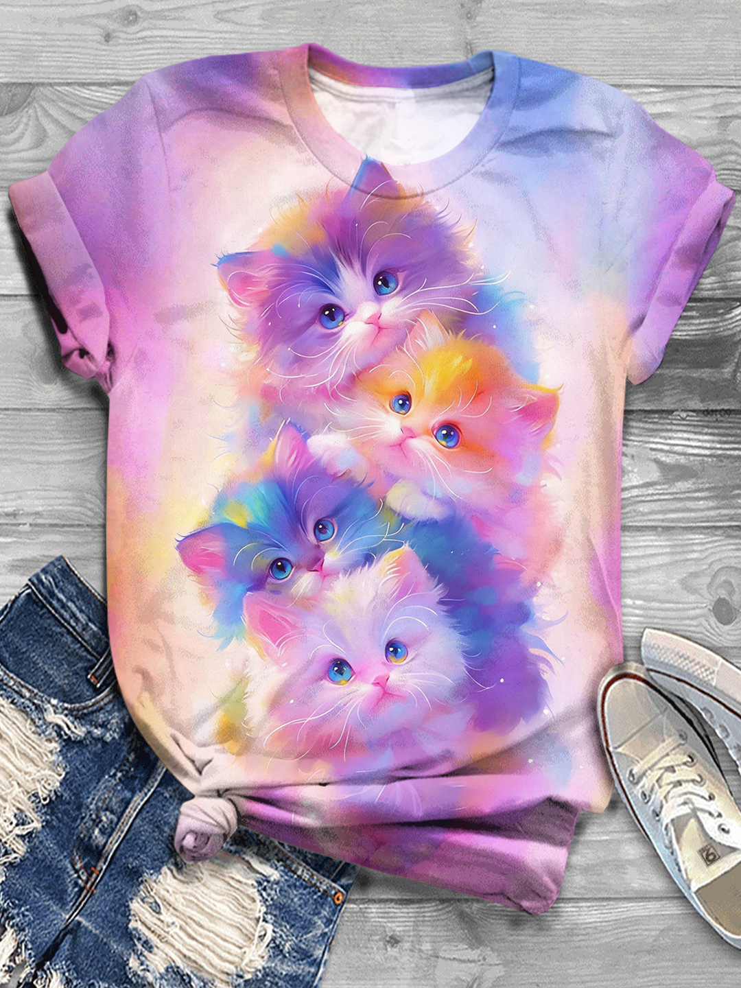 Pastel Rainbow Kitten Crew Neck T-shirt