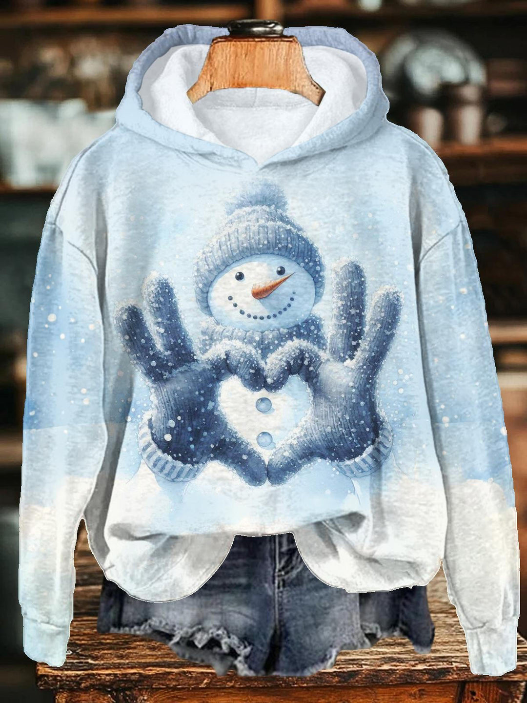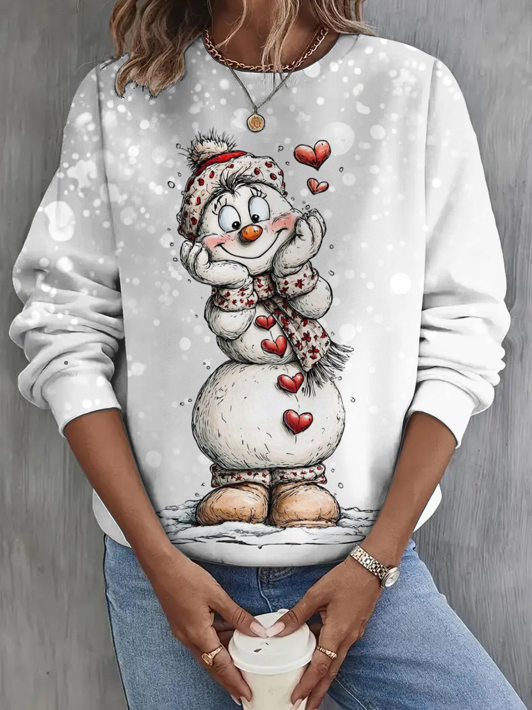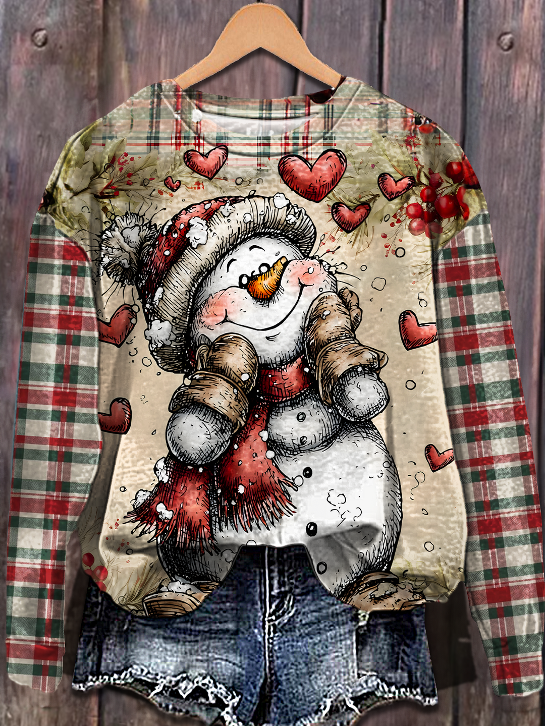 Retro Winter Heart-Shaped Snowman Printed Long Sleeve Casual Top