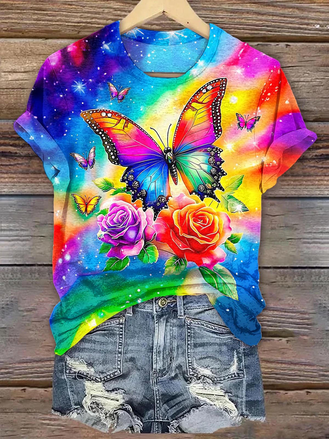 Butterfly Holiday Tie-Dye Print Crew Neck T-shirt
