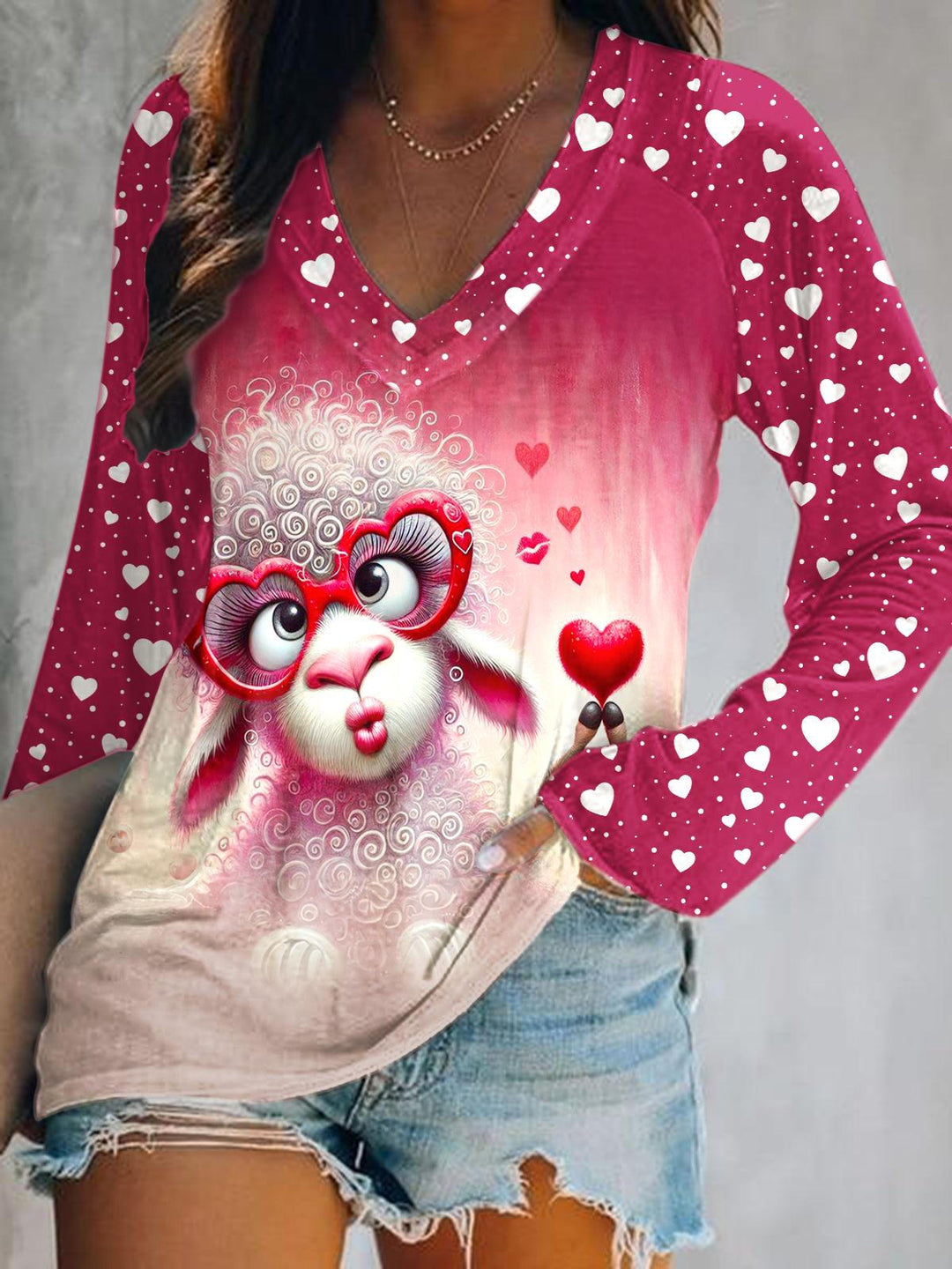 Valentine's Day Lamb Print V-Neck Long Sleeve Top