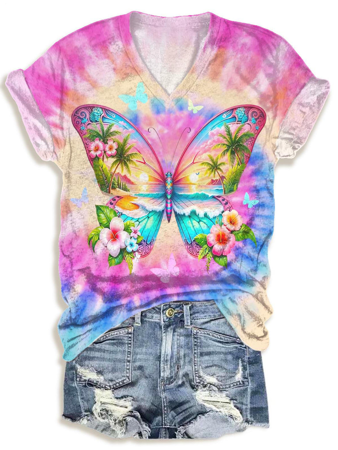 Holiday Butterfly Tie-Dye Print V-neck T-Shirt