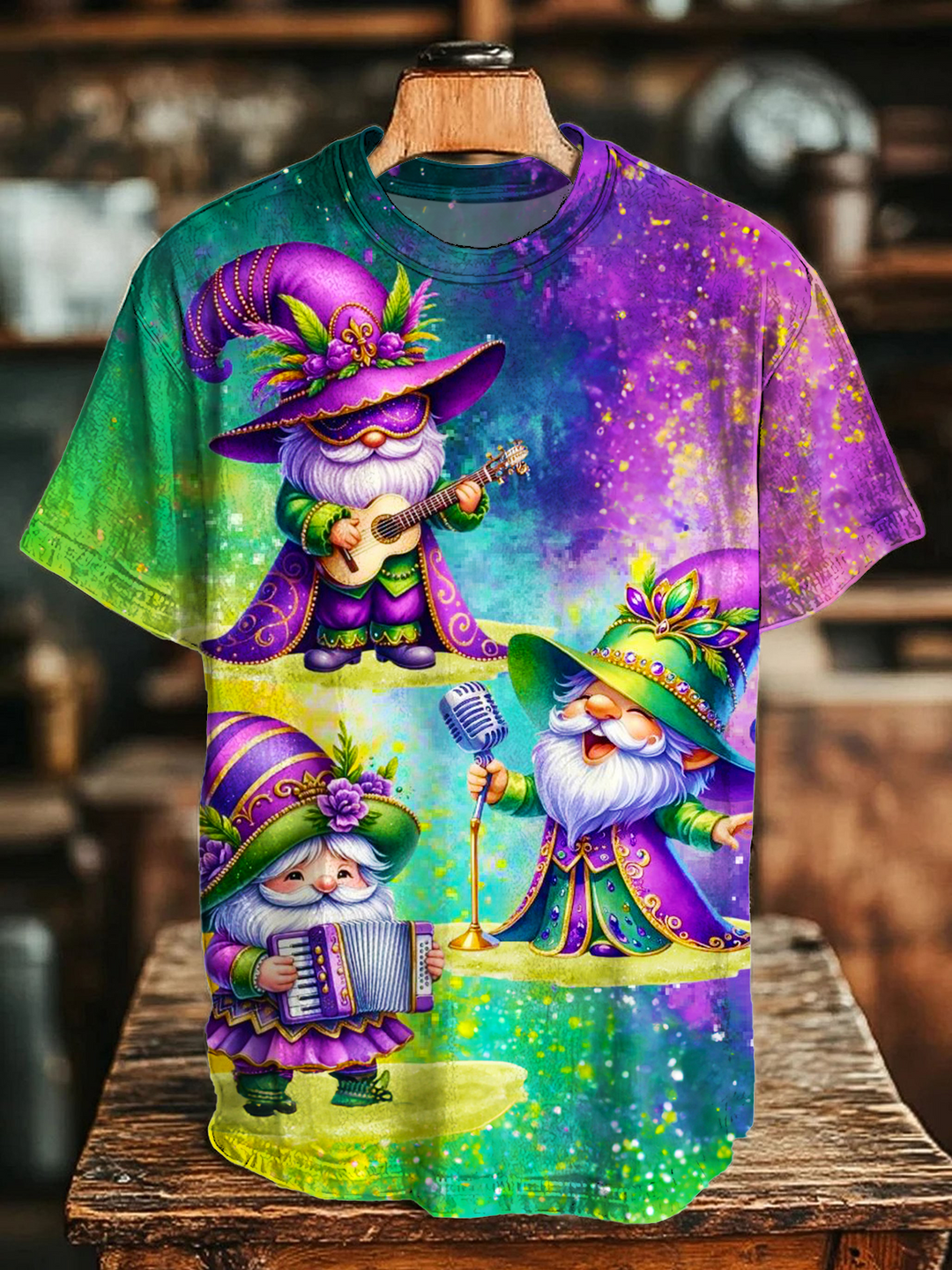 Mardi Gras Gnome Watercolor Art Crew Neck T-shirt