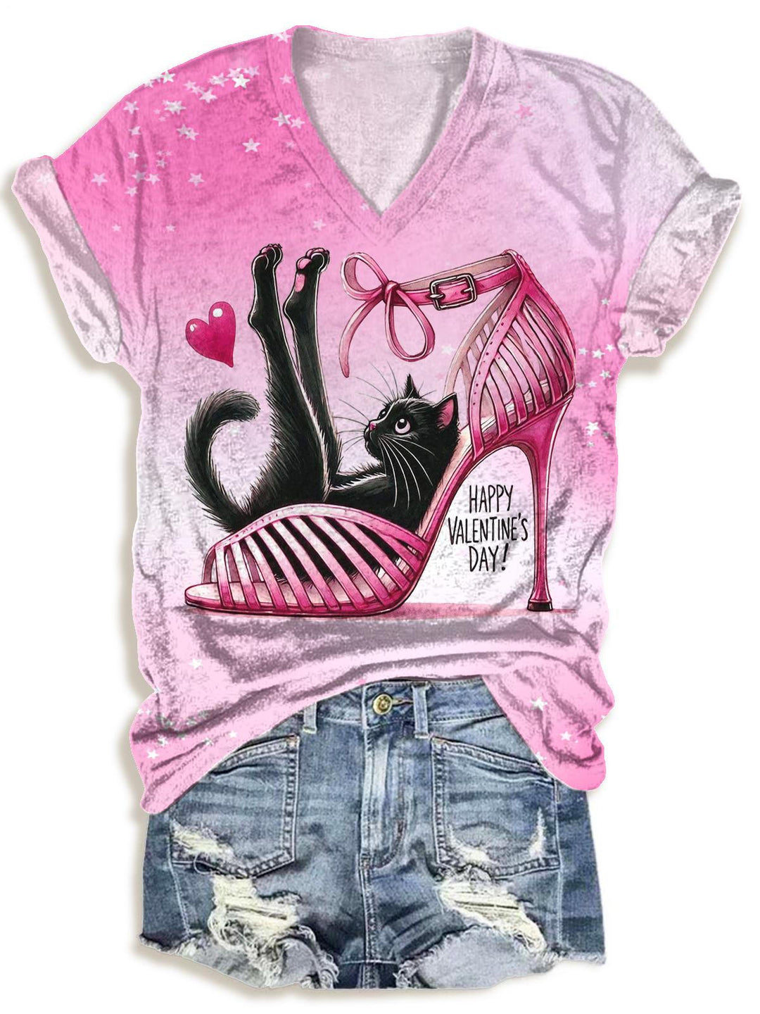Valentine's Day High Heels Cat Print V-neck T-Shirt