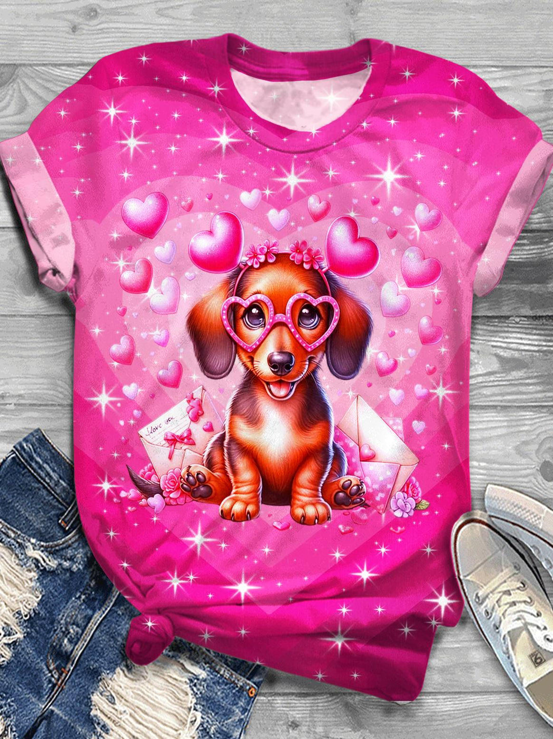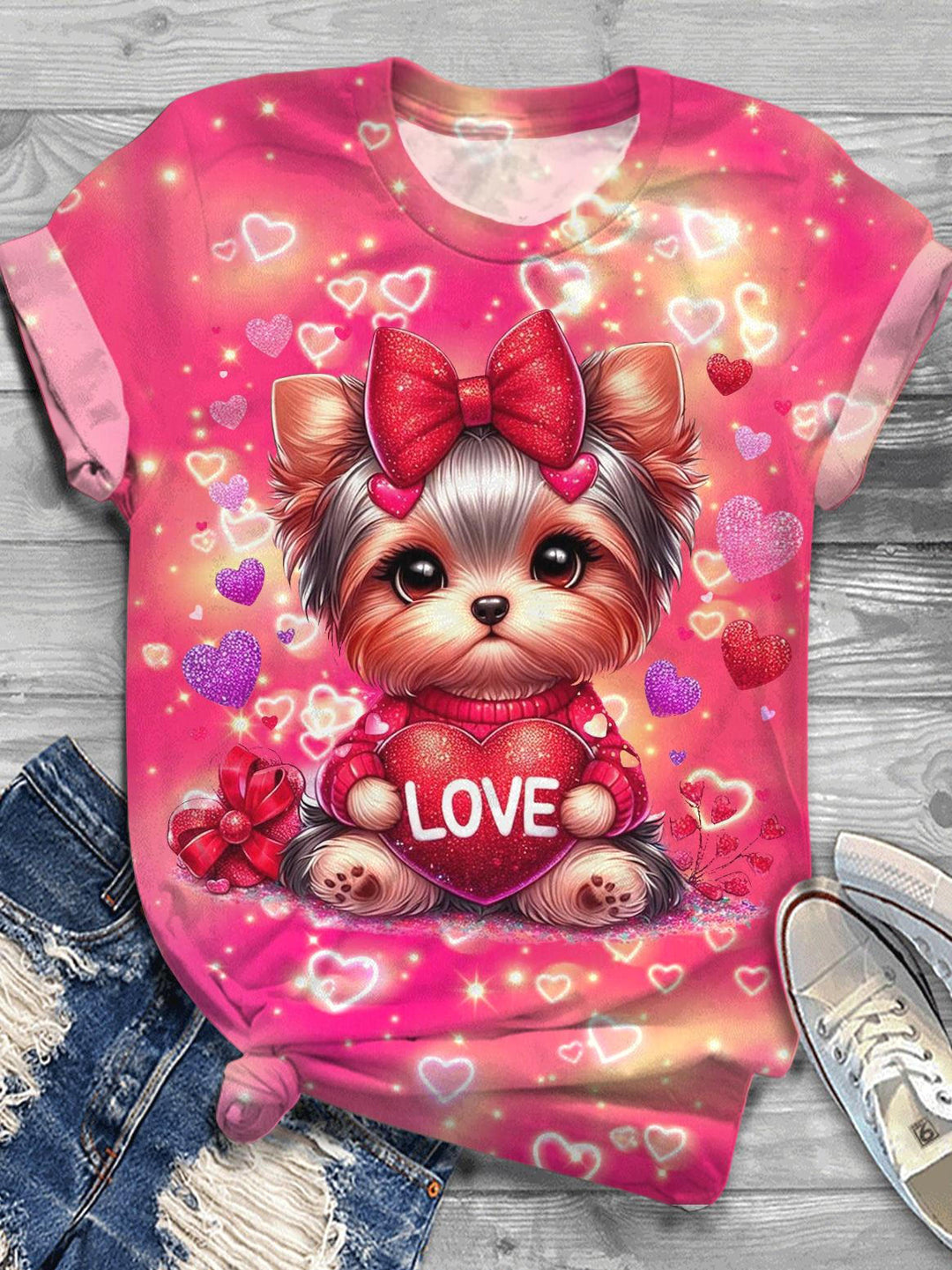 Valentine's Day Cat And Heart Print Crew Neck T-shirt