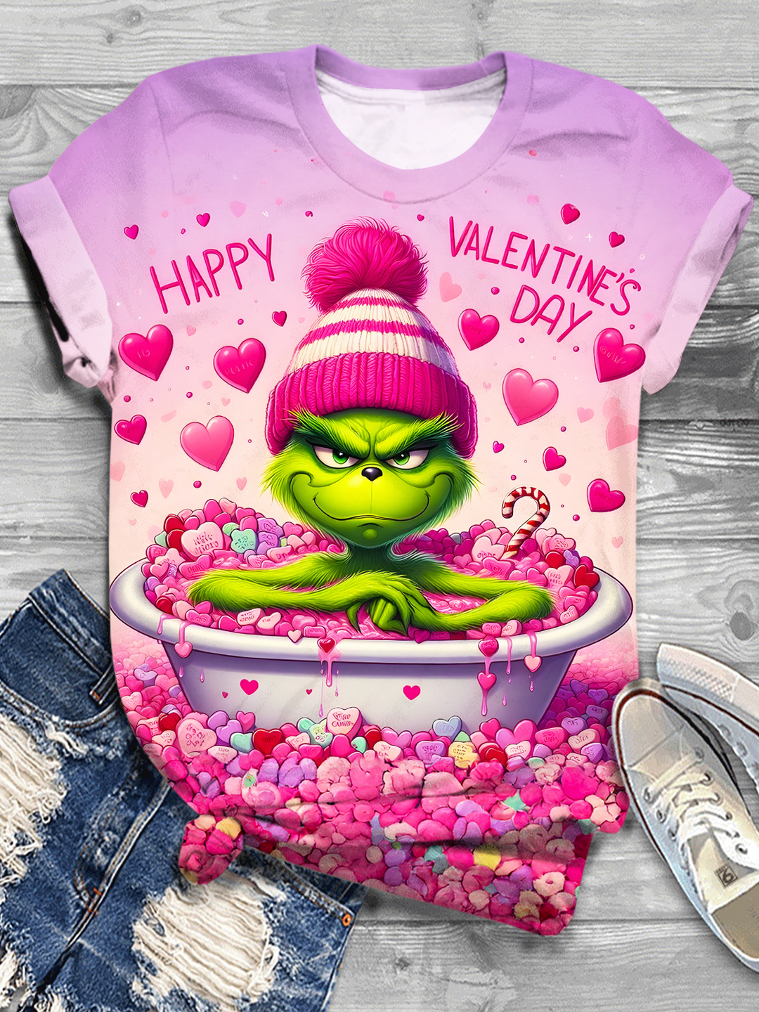 Happy Valentine's Day with Fun Cartoon Grinch Crew Neck T-shirt