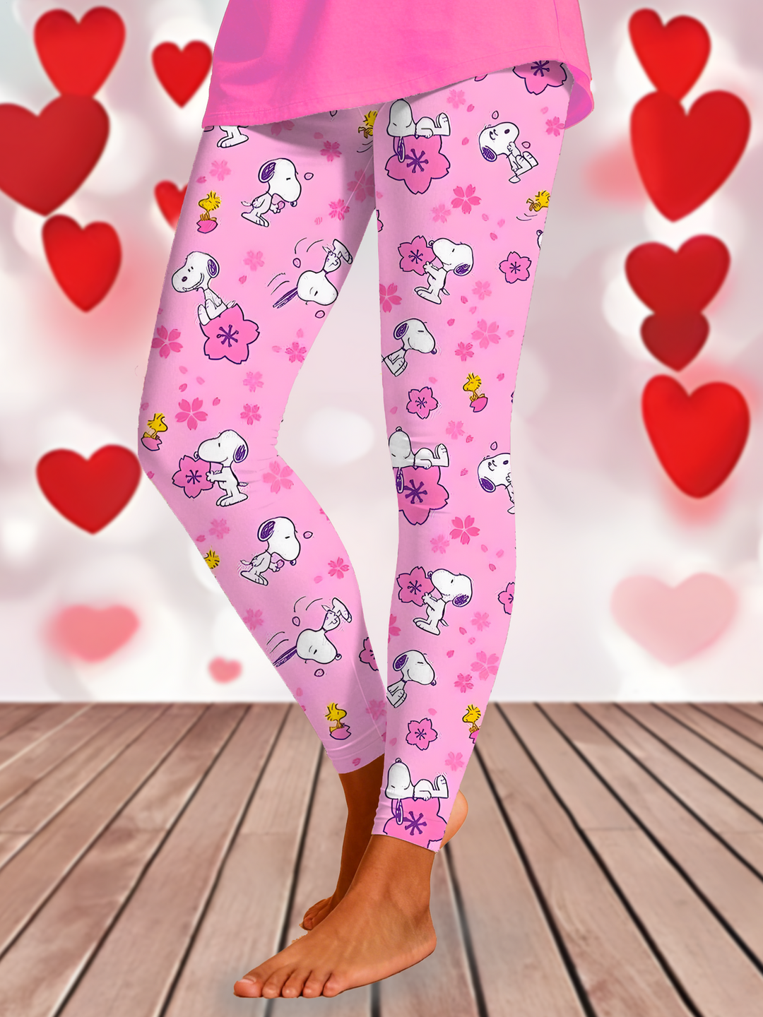 Valentine's Day Pink Cherry Blossom Snoopy Print Leggings