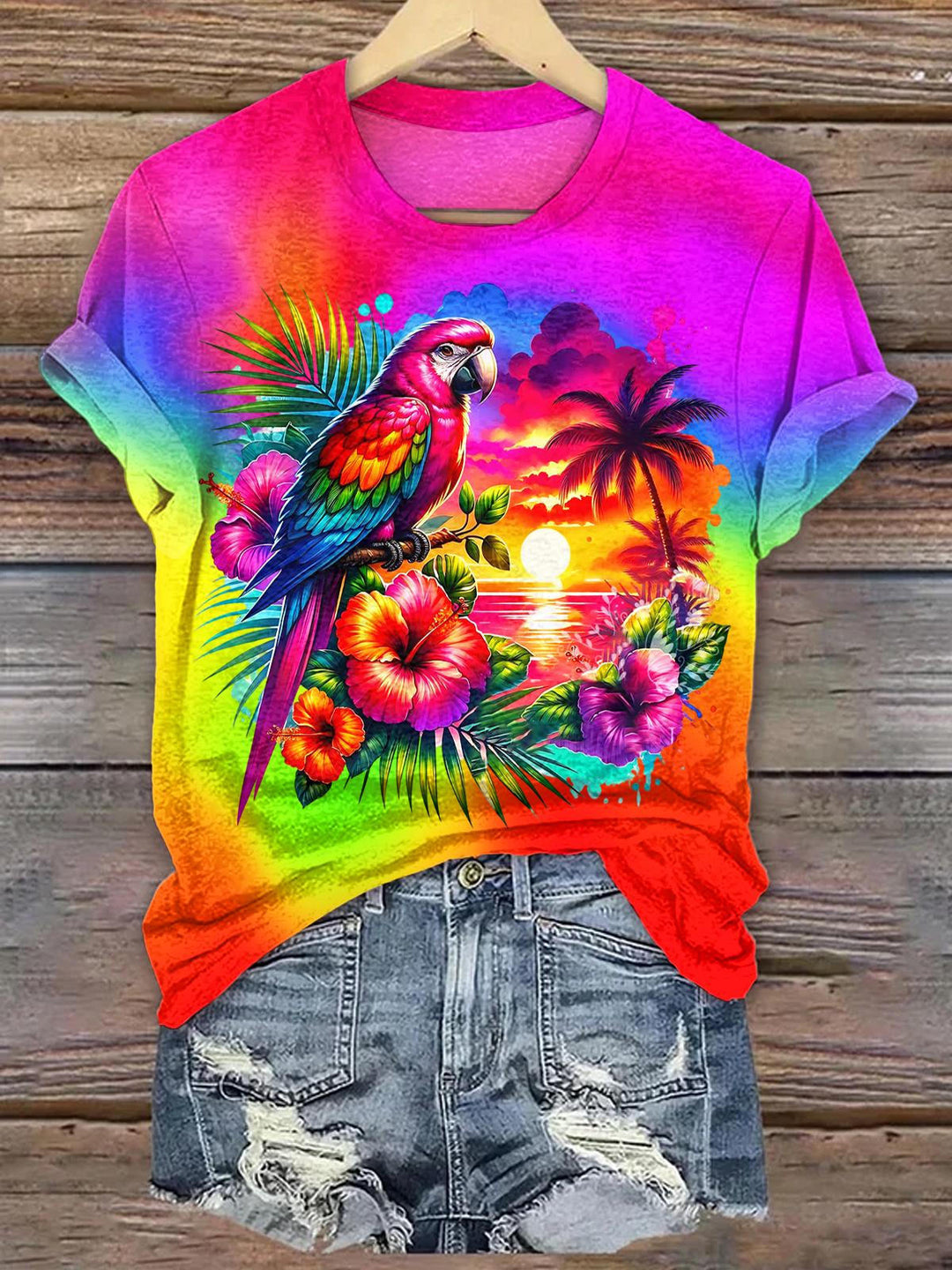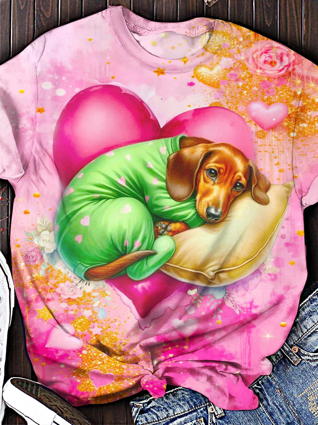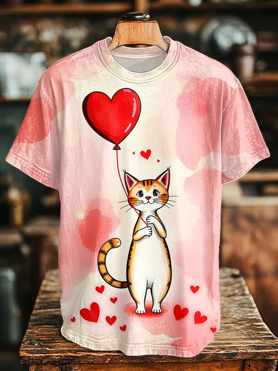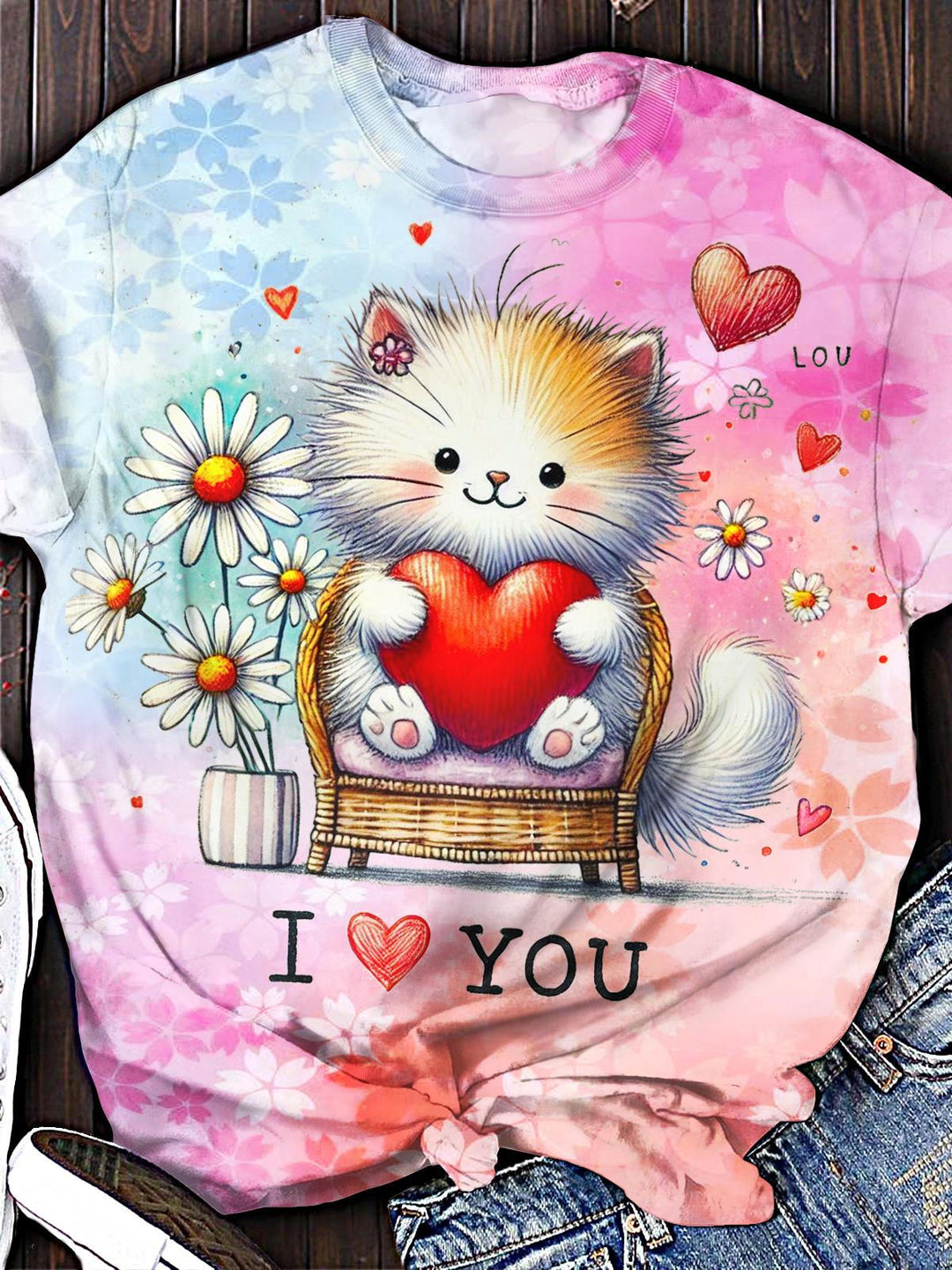 Valentine's Day Cat Printed Crew Neck T-shirt