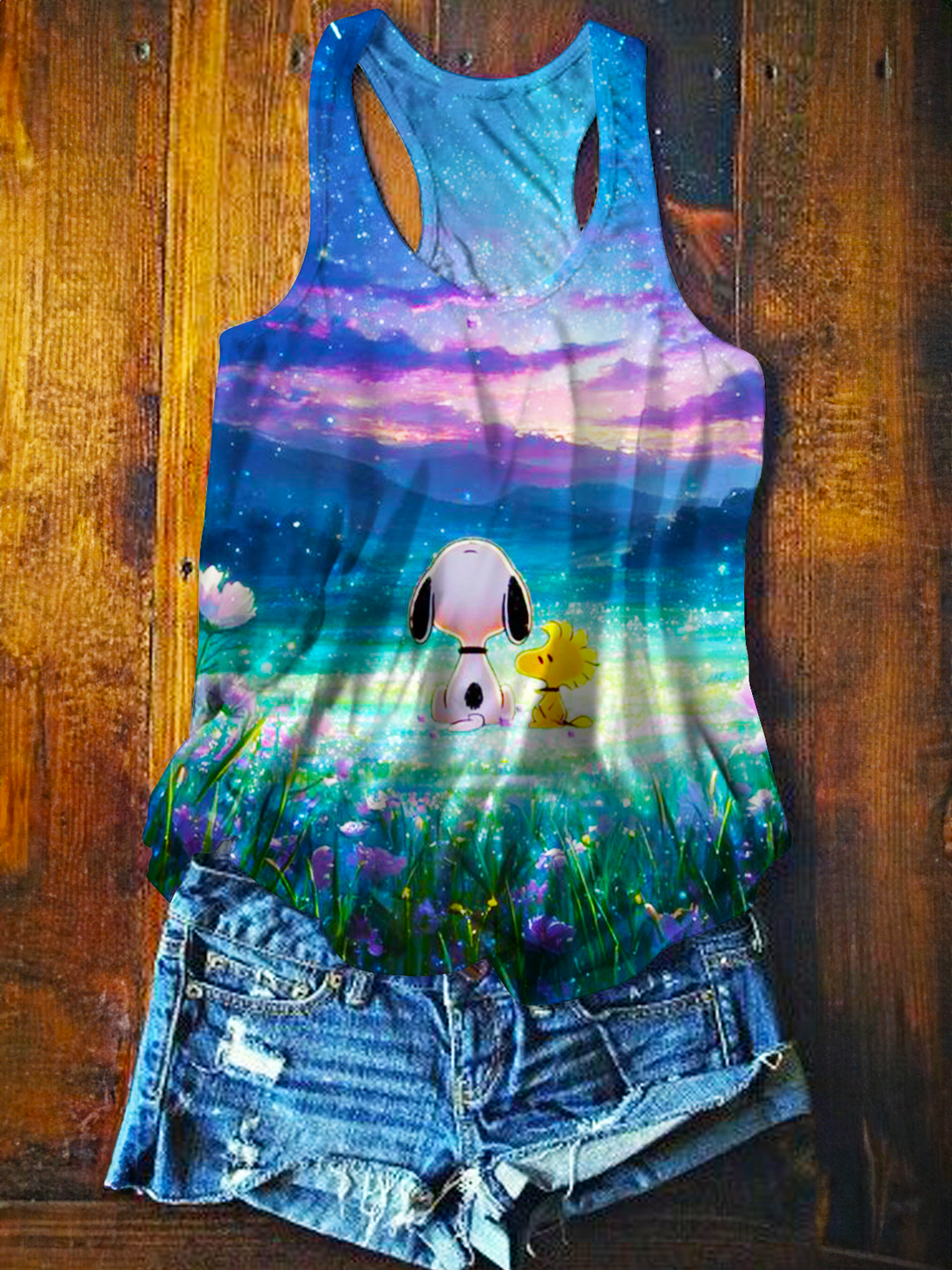 Beautiful Starry Scene With Snoopy and Woodstock Printed Casual Tank Top