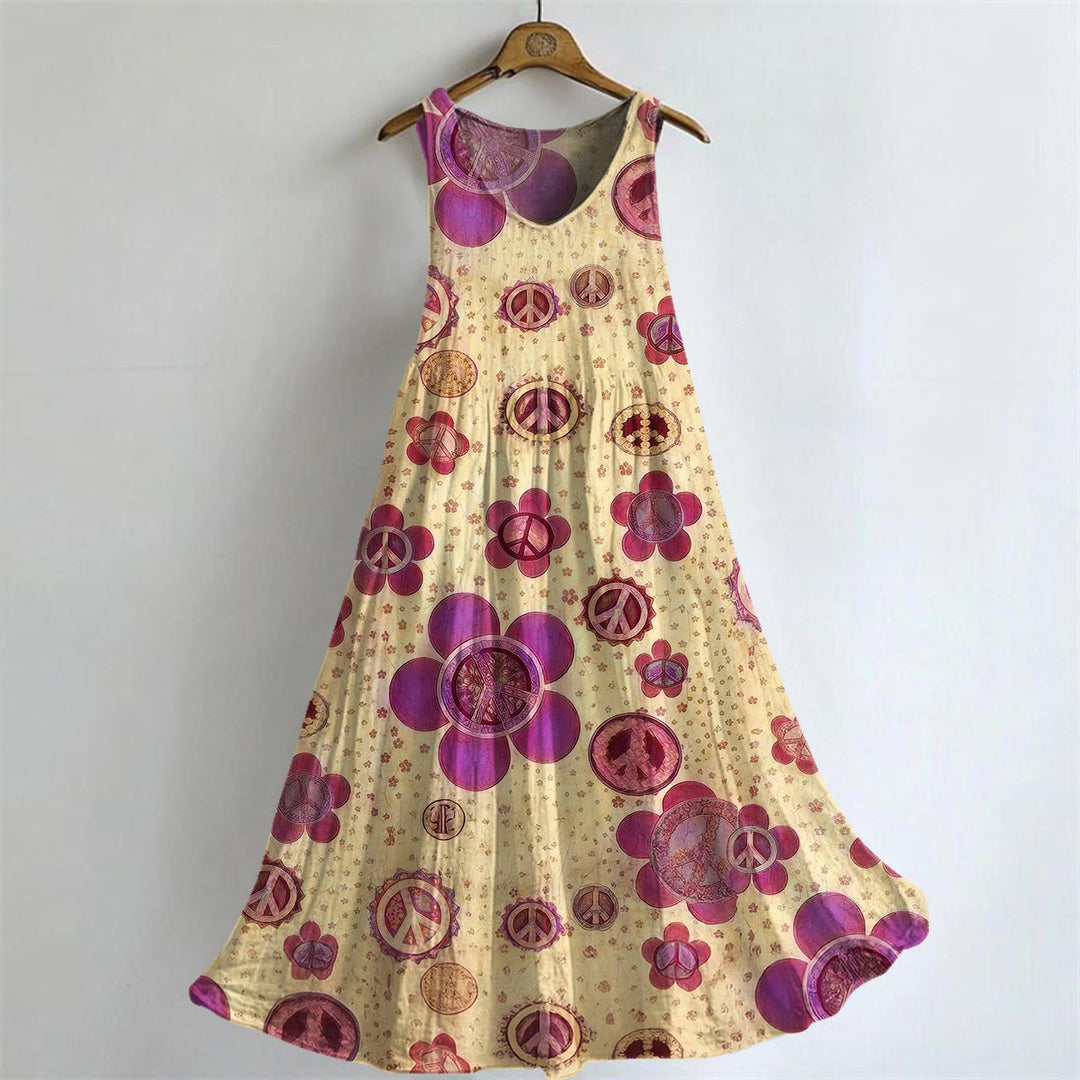 Hippie Retro Floral Print V-neck Bamboo Linen Sleeveless Dress