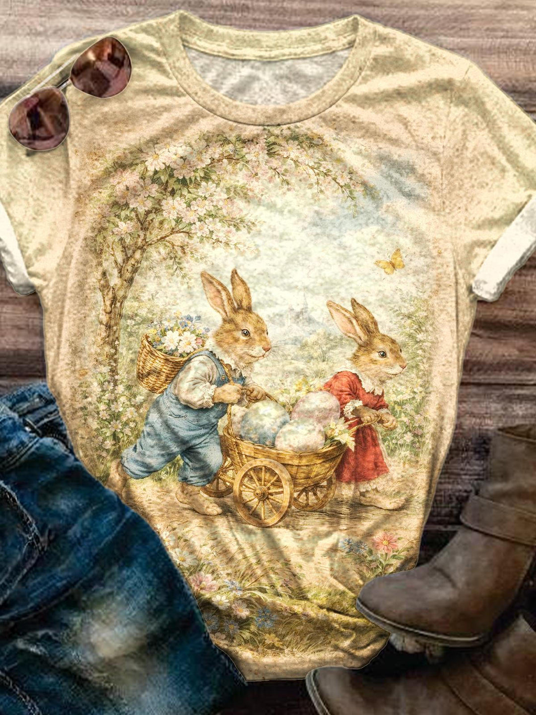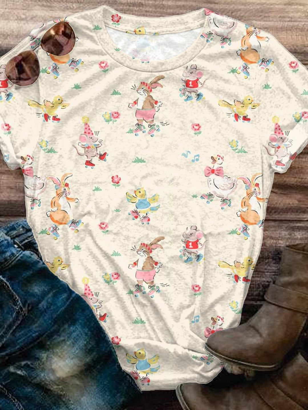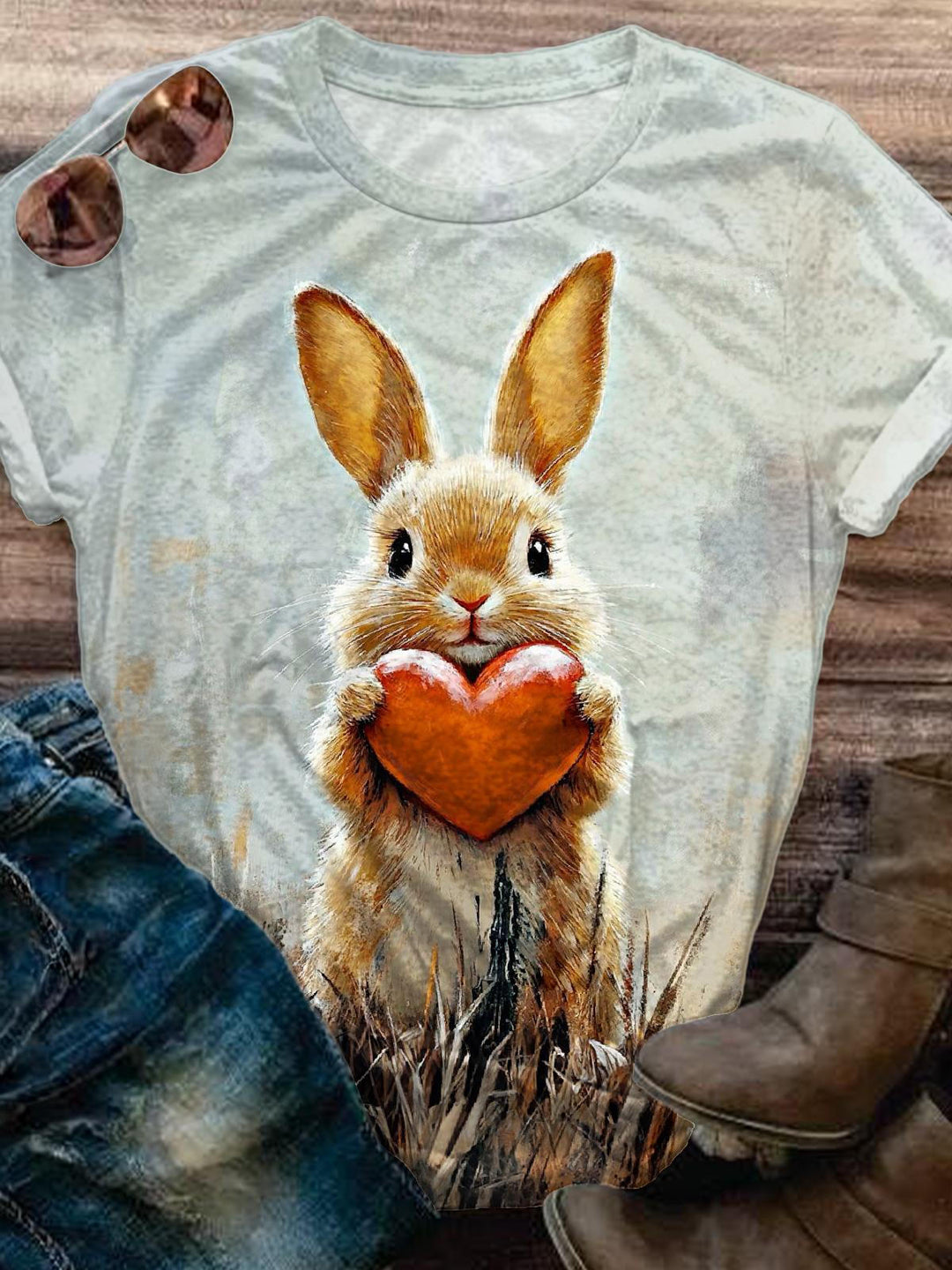 Retro Heartwarming Rabbit Crew Neck T-shirt