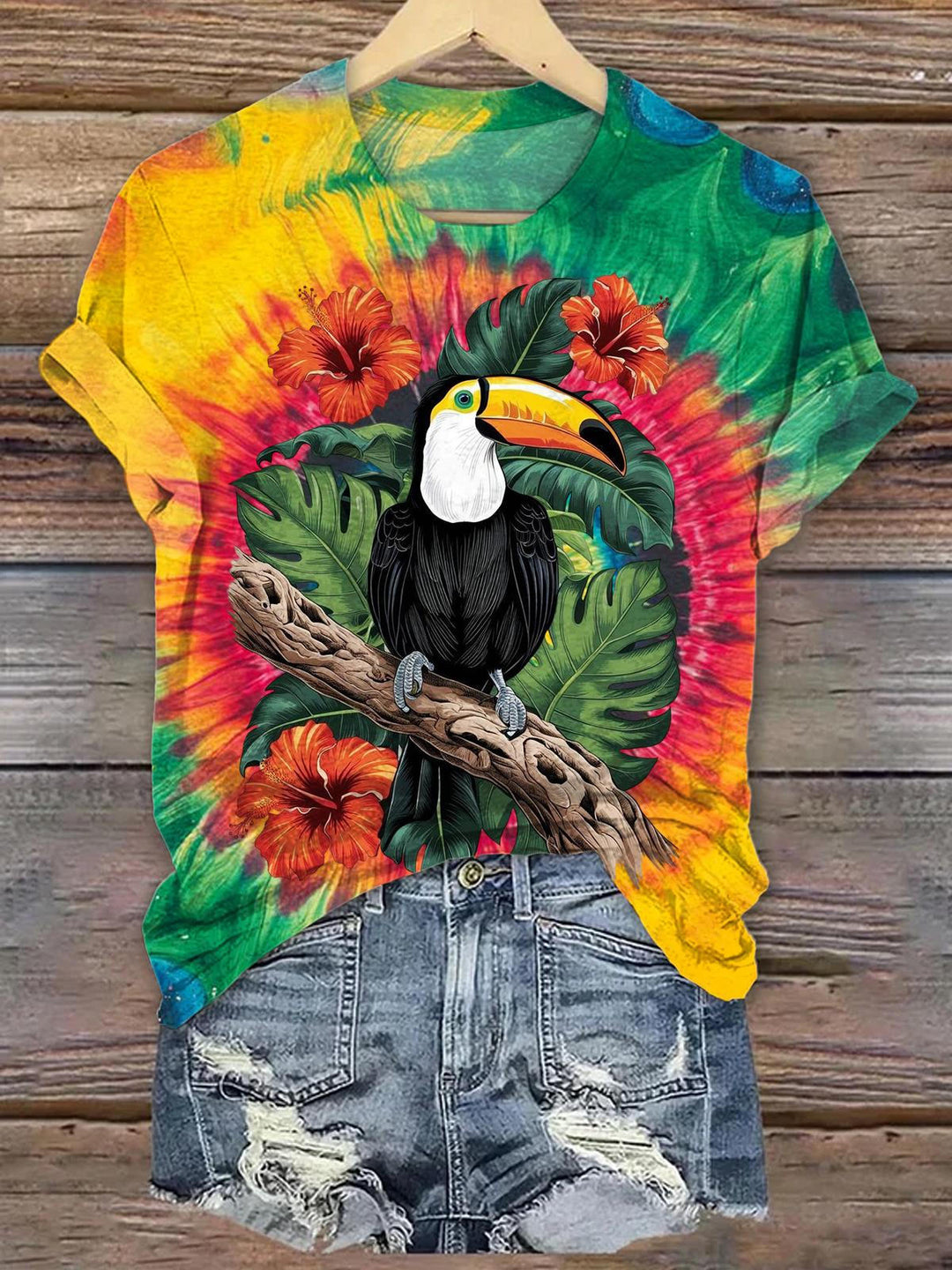 Retro Tie dye Flower and Bird Crew Neck T-shirt