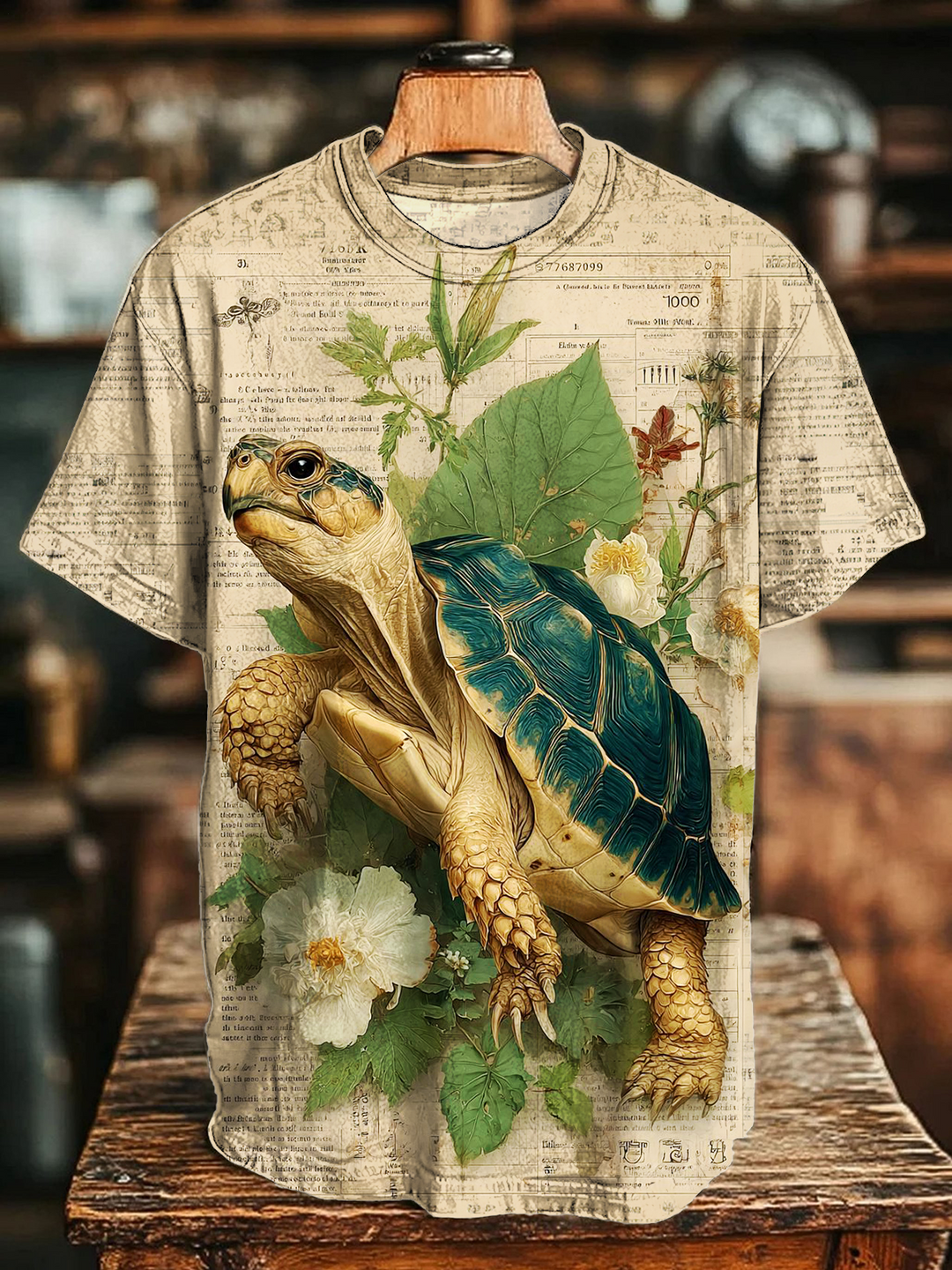 Retro Floral Turtle Art Crew Neck T-shirt