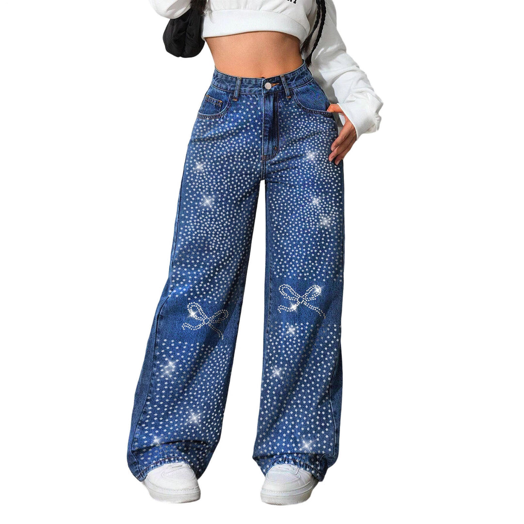 Rhinestone Jeans for Women Bow High Waist Vintage Straight Leg Trousers Casual Denim Pants Everyday Wear fit