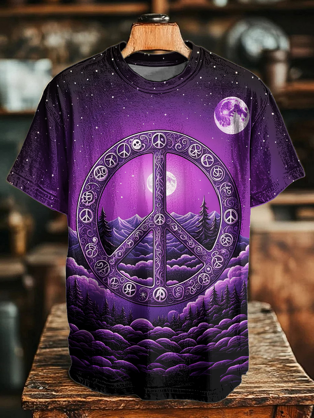Beaming Neon Psychedelic Forest Peace Sign Crew Neck T-shirt