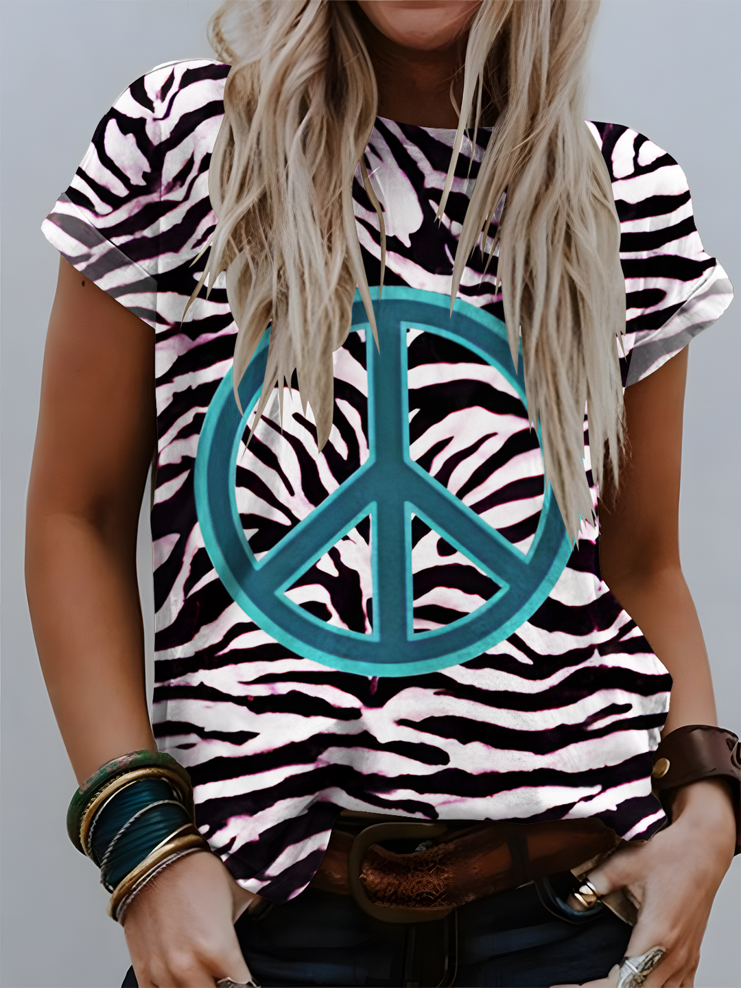 Vintage Zebra Print Peace Sign Crew Neck T-shirt